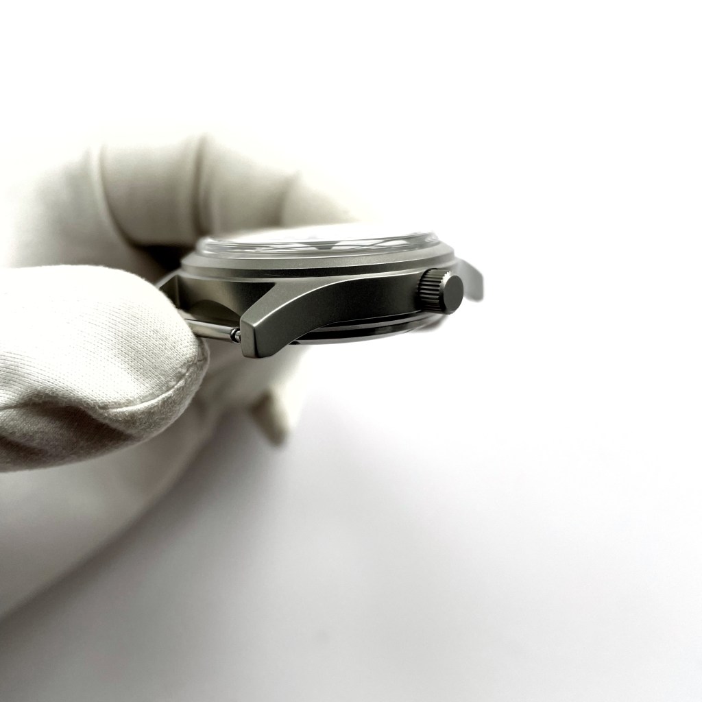 The 36mm case is a solid 316 stainless steel case, with a fixed bezel. It has been professionally sand blasted. Sandblasting gives the case a tactile and matt finish to complement the military style. The case also features a brushed stainless steel screwed-down case back and a screwed-down crown to improve the water resistance to 100M.