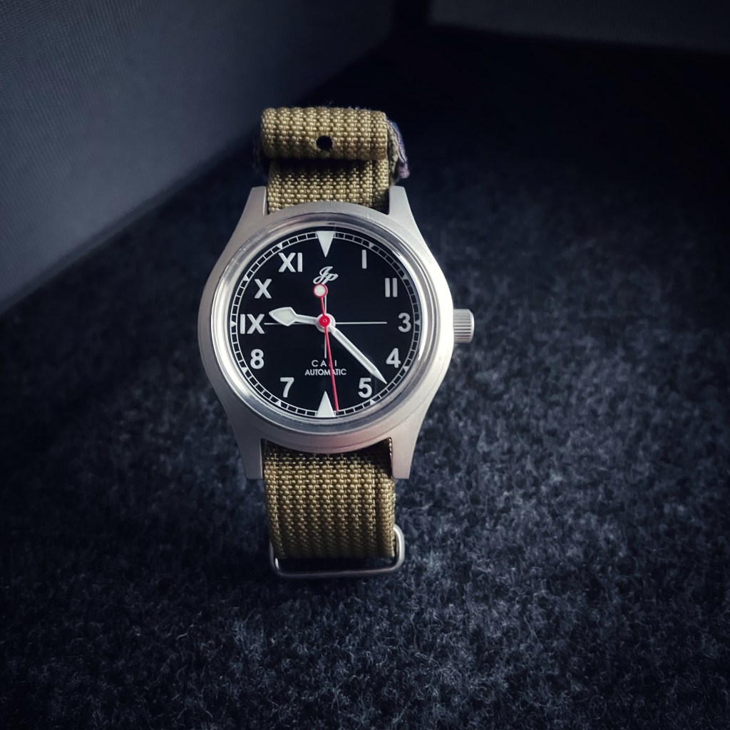 Timing is done by the Seiko NH3X series automatic movements (such as the NH35, NH36 or NH38) which run at 21600bph and have 41h power reserve. Like all good military field watches this movement features a hacking seconds hand, meaning the second hand stops when the crown is pulled out into setting position. This makes regulation and synchronisation much more accurate.